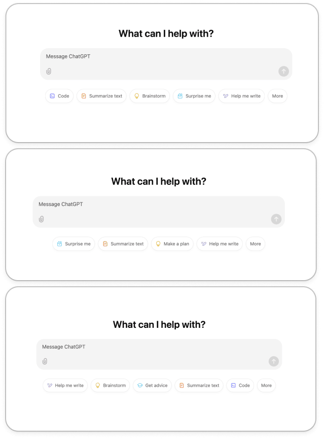 Moreover, there’s a detail that I only noticed when refreshing the landing page in an incognito tab: the pills change. The next time I open the landing page, I see: Code, Summarise text, Brainstorm, Surprise me, Help me write, More. On the third time, I see: Help me write, Brainstorm, Get advice, Summarize text, Code, More. Each pill is a genius use of ChatGPTs Jobs to Be Done, showing the user what tasks are possible. All bar the ‘surprise me’ pill, which is an example of a Curiosity Gap 🧠 — when missing or intriguing information in an experience motivates the user to take action. So, I follow my curiosity, tap ‘surprise me’ and see what looks more like Google search’s UI, with Make a plan pre-typed into the search bar.