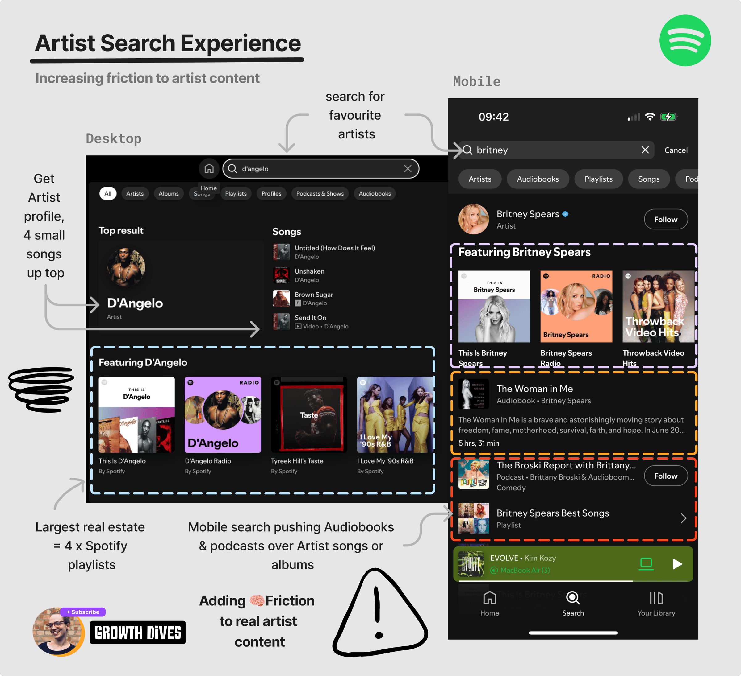 Gone are the days where I can search Britney and find her songs easily. Instead, I’m stuck behind friction in the user interface to get to real artists, real albums and songs. Within the search experience on both mobile and desktop, I’m: