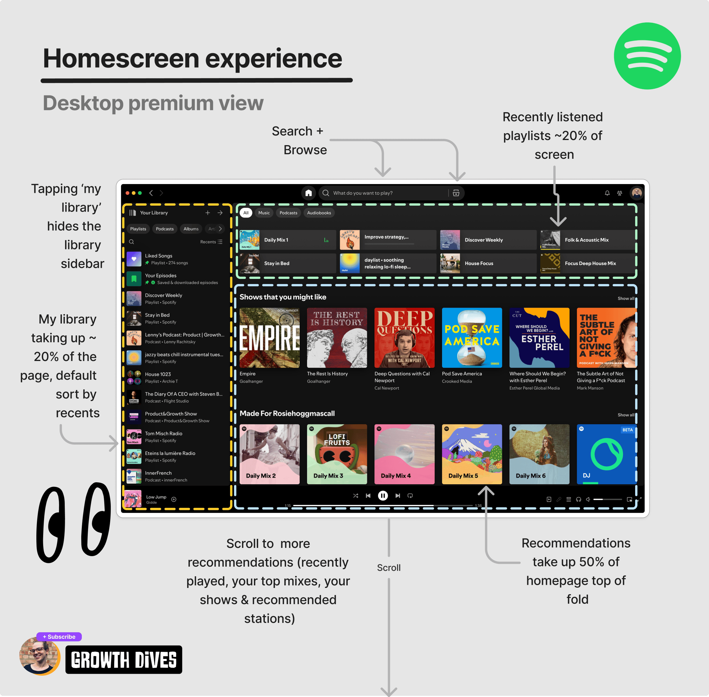 Why am I telling you this?With podcasts showing to be a profit-driver for the business, cost-cutting taking stage and the subtle feeling that it’s harder to find songs, what I’m going to show you next will make a lot more sense. Now, on to the fun stuff: the user experience. Spotify’s Home experienceDoes anyone else feel like this: